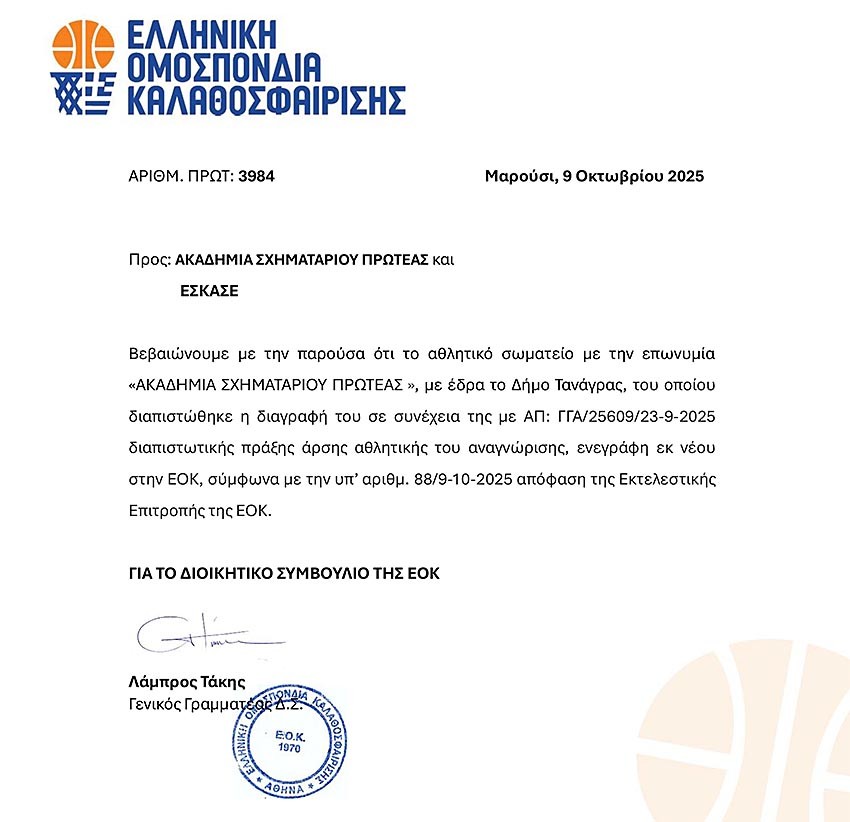 Και ενώ η Εκτελεστική Επιτροπή της ΕΟΚ έλαβε αυτή την απόφαση στις 8 Οκτωβρίου, η Ομοσπονδία επανήλθε ξαφνικά και ανερυθρίαστα: Προφανώς με οδηγία και πάντως σε γνώση του Βαγγέλη Λιόλιου, ο γενικός γραμματέας της ΕΟΚ Λάμπρος Τάκης ενέγραψε εκ νέου τον Πρωτέα Σχηματαρίου, (με την υπ’ αριθμ. 88/9-10-2025, της Εκτελεστικής Επιτροπής, όπως αποκαλύπτει το ebasket.gr).
