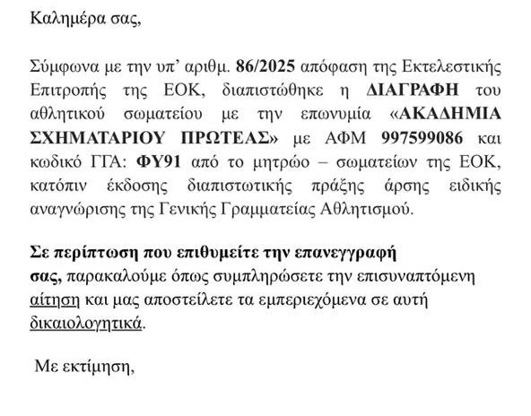Μόνο που υπάρχει μία ένσταση: Για να εγγραφεί ένα σωματείο, που έχει διαγραφεί από το Μητρώο της ΓΓΑ, πρέπει να προηγηθεί απόφαση της ΓΓΕ που το αναγνωρίζει ξανά. Αλλά τέτοια απόφαση από τη ΓΓΑ δεν υπάρχει – μία απλή αναζήτηση στο σύστημα το αποδεικνύει. Η ΕΟΚ κινήθηκε αυτόνομα, γιατί έτσι θέλει και… (νομίζει ότι) μπορεί.