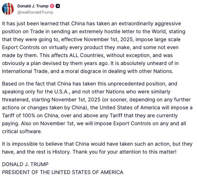 Σε μια ανάρτηση στο Truth Social, ο Τραμπ δήλωσε: «Από την 1η Νοεμβρίου 2025 (ή νωρίτερα, ανάλογα με τυχόν περαιτέρω ενέργειες ή αλλαγές που θα κάνει η Κίνα), οι Ηνωμένες Πολιτείες Αμερικής θα επιβάλουν δασμό 100% στην Κίνα, πέραν οποιουδήποτε δασμού που πληρώνουν επί του παρόντος».
