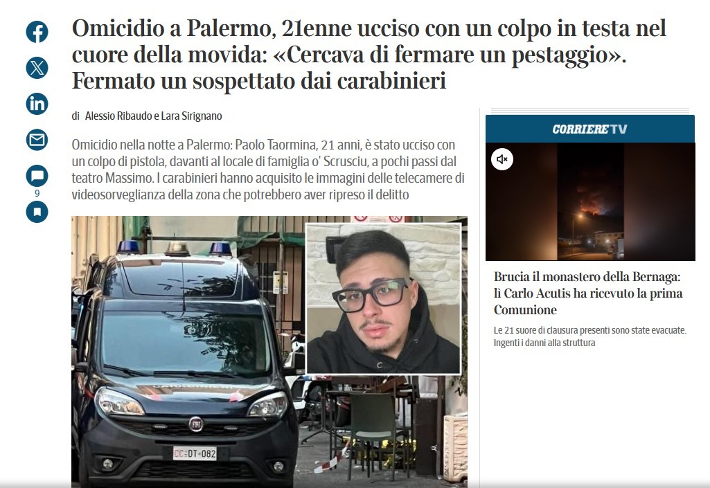Σοκ έχει προκαλέσει στο Παλέρμο η δολοφονία του 21χρονου Πάολο Ταορμίνα, ο οποίος έπεσε νεκρός από πυροβολισμό στο κεφάλι, όταν επιχείρησε να σταματήσει καβγά έξω από το εστιατόριο των γονιών του το βράδυ του Σαββάτου.