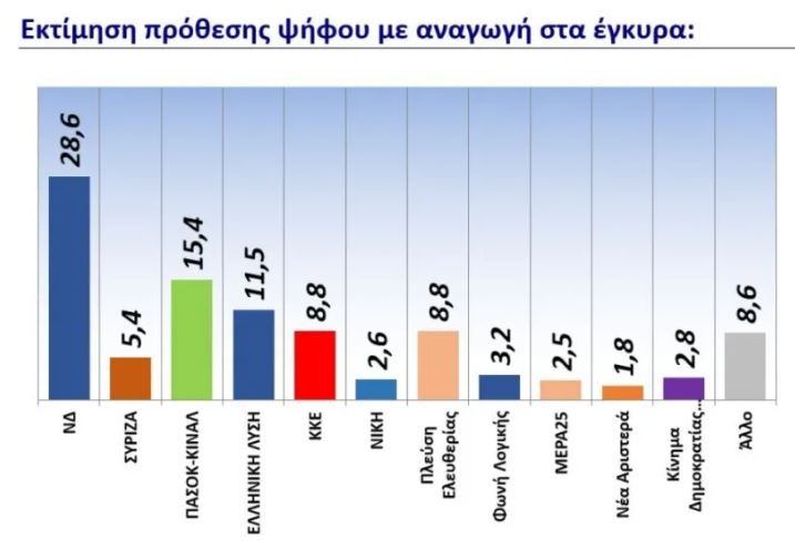 Στην εκτίμηση δεν υπάρχουν μεγάλες διαφοροποιήσεις. Η ΝΔ έχει προβάδισμα μς 28,6% έναντι 15,4% του ΠΑΣΟΚ, ενώ στο 11,5% είναι το κόμμα του Κ. Βελόπουλου και ακολουθούν με 8,8% ΚΚΕ και Πλεύση, με 5,4% ο ΣΥΡΙΖΑ και με 3,2 η Φωνή Λογικής. Οριακά εκτός είναι το Κίνημα Δημοκρατίας του Στ. Κασσελάκη (2,8%), όπως και η Νίκη (2,6%) και η ΜέΡΑ25 (2,5%).