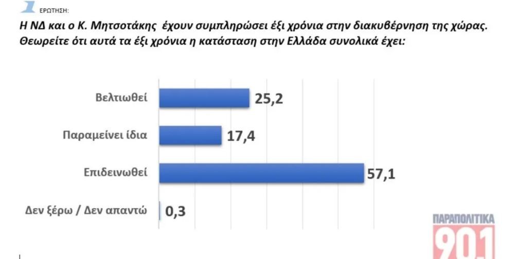 Αυτό αποτυπώνεται και στο επόμενο ερώτημα που αφορά την άποψη του κόσμου για τα έξι χρόνια διακυβέρνησης της ΝΔ, όπου το 57,1% λέει ότι η κατάσταση στη χώρα έχει επιδεινωθεί.