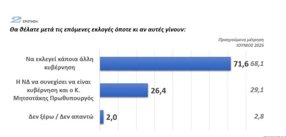 Ενδεικτικό της δυσαρέσκειας προς τη κυβέρνηση, είναι ότι το 71,6% λέει ότι δεν θέλει ξανά τη ΝΔ στο τιμόνι.