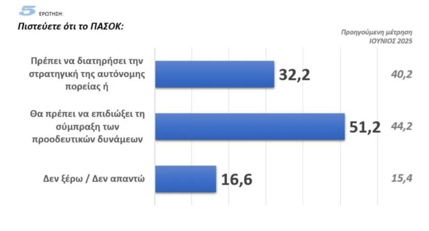 Στο ΠΑΣΟΚ, το 51,2% του συνόλου τάσσεται υπέρ της συνεργασίας των προοδευτικών δυνάμεων με το 32,2% να προτιμά την αυτόνομη πορεία.