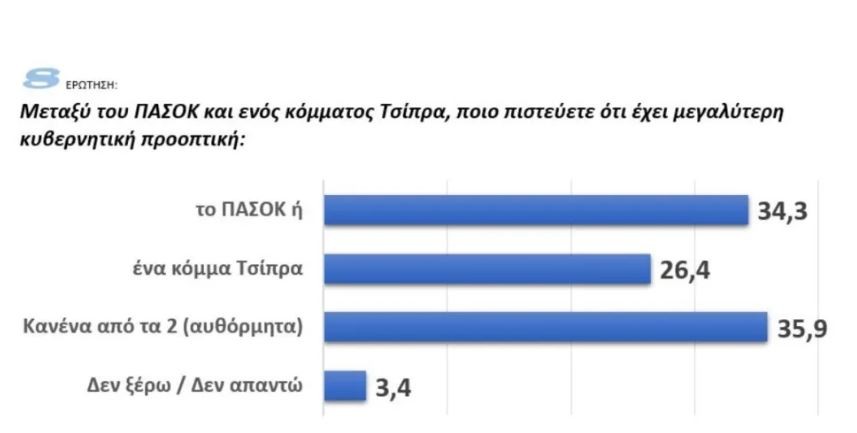 Στο ερώτημα αν θα είχε μεγαλύτερη προοπτική το ΠΑΣΟΚ, ένα κόμμα του Τσίπρα ή τίποτα από τα δύο, η τρίτη επιλογή συγκεντρώνει 35,9% ενώ το ΠΑΣΟΚ ακολουθεί με 34,3% και ένα κόμμα Τσίπρα 26,4%