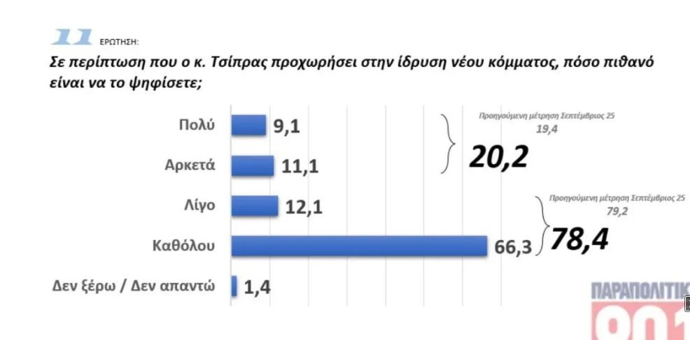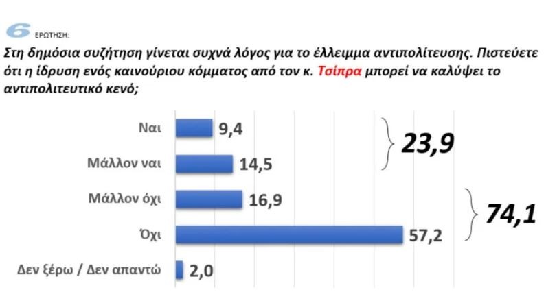 Πιο συγκεκριμένα, με αφορμή το ενδεχόμενο ίδρυσης ενός νέου κόμματος από τον Αλέξη Τσίπρα, οι ερωτηθέντες σε ποσοστό 23,9% πιστεύουν ότι αυτό θα μπορούσε να καλύψει το αντιπολιτευτικό κενό, ενώ το 74,1% είναι αντίθετο.