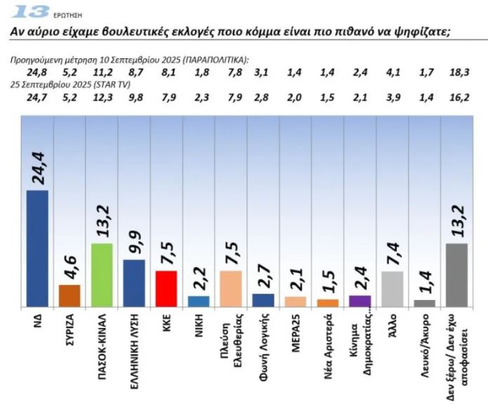 Στην πρόθεση ψήφου η ΝΔ παραμένει σε ποσοστά κάτω του 25% και συγκεκριμένα στο 24,4%, χάνοντας ξανά σε σχέση με τον προηγούμενο μήνα. Αντίθετα, το ΠΑΣΟΚ κερδίζει μία μονάδα και πάει στο 13,2%, διαφορά 11,2 μονάδων.