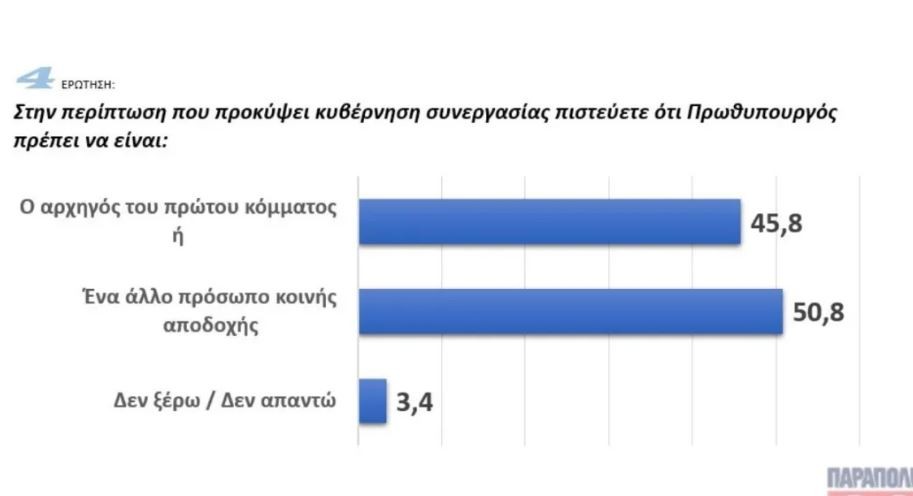 Ιδιαίτερο ενδιαφέρον έχει η απάντηση των πολιτών στο ερώτημα αν θα προτιμούσαν σε περίπτωση κυβέρνησης συνεργασίας έναν πρωθυπουργό του πρώτου κόμματος ή κοινής αποδοχής. Ο κοινής αποδοχής συγκεντρώνει ποσοστό 50,8% έναντι 45,8% του πρώτου κόμματος.