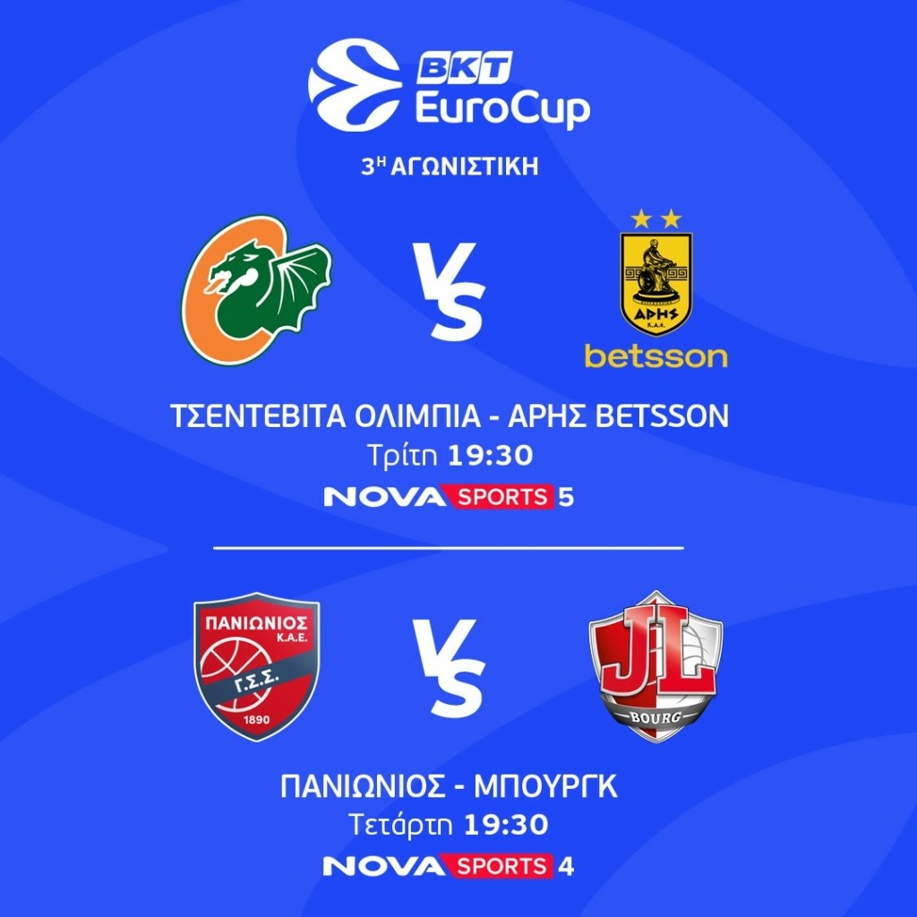 Το EuroCup συνεχίζεται με αμείωτο ενδιαφέρονκαι τη διπλή ελληνική εκπροσώπηση, και για την 3η αγωνιστική οι συνδρομητές θα απολαύσουν Τσεντεβίτα Ολίμπια-Άρης Betsson (14/10, 19:30) και Πανιώνιος – Μπουργκ (15/10, 19:30).