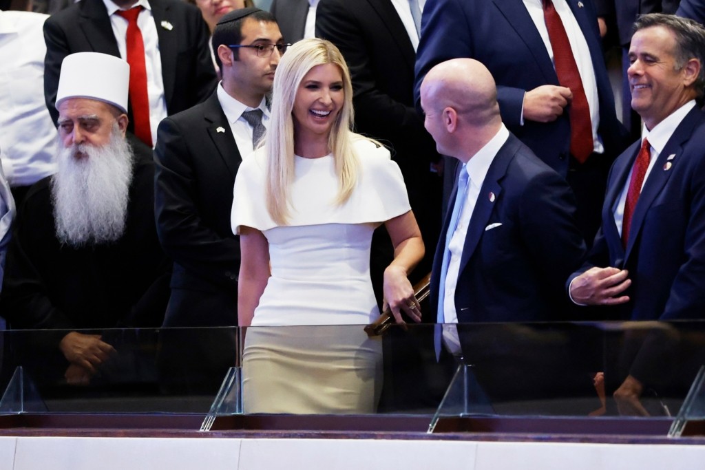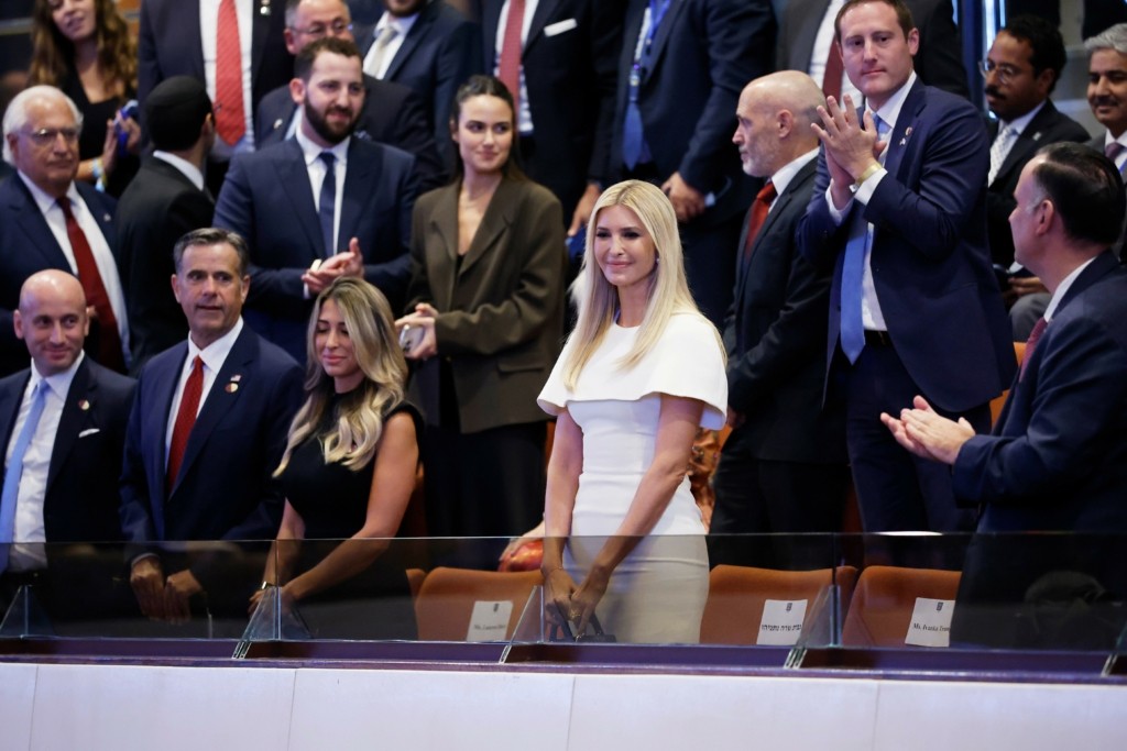 Ντυμένη στα λευκά, η Ιβάνκα Τραμπ καταχειροκροτήθηκε κατά την είσοδό της στην ισραηλινή Βουλή για να παρακολουθήσει την ομιλία του πατέρα της, ενώ η ίδια ανταπέδωσε, με μια κίνηση του χεριού της.