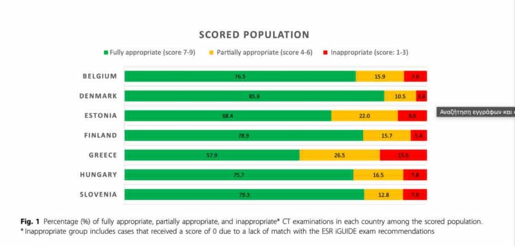 Το μέσο ποσοστό καταλληλότητας ήταν 75%, που κυμαίνονταν από 58% στην Ελλάδα έως 86% στη Δανία. Υψηλότερα ποσοστά συσχετίστηκαν με δημόσια νοσοκομεία, νοσηλευόμενους ασθενείς και παραπομπές από ειδικούς. Υπήρχε διακύμανση στην καταλληλότητα ανά χώρα και ανατομική περιοχή, ηλικία και φύλο του ασθενούς. Συνήθεις εναλλακτικές συστάσεις για εξετάσεις περιλάμβαναν μαγνητική τομογραφία, ακτινογραφία και υπερηχογράφημα.