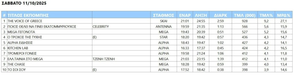 Τα τηλεοπτικά γούστα του γουίκεντ ήταν τα αναμενόμενα. Τα περισσότερα βλέμματα συγκέντρωσαν – και με διαφορά από τον ευρύτερο ανταγωνισμό – το μουσικό σόου «The Voice», και του Σαββάτου και της Κυριακής, αλλά και η απευθείας μετάδοση του ποδοσφαιρικού αγώνα Δανίας- Ελλάδας για τα προκριματικά του Μουντιάλ.