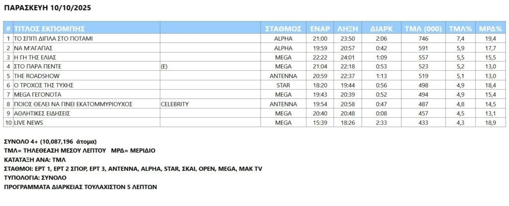 Σταθερή προτίμηση των περισσότερων τηλεθεατών και αυτή την Παρασκευή ήταν η δραματική σειρά εποχής «Το σπίτι δίπλα στο ποτάμι», η οποία μαζί με την επίσης δραματική «Να μ’ αγαπάς» κατάφεραν το 1-2 για τον Alpha στο Top 10 της ημέρας.
