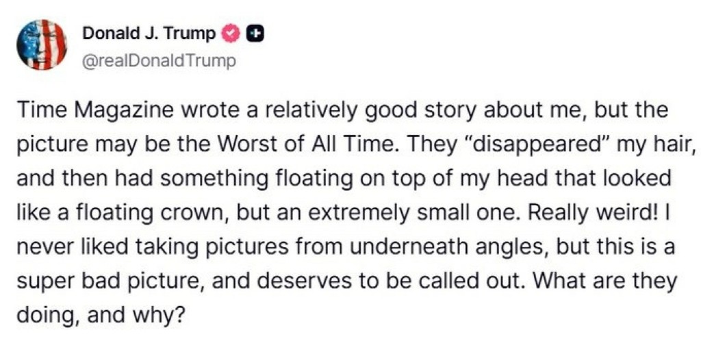Ο Τραμπ έγραψε στο Truth Social ότι το περιοδικό έγραψε μια «σχετικά καλή ιστορία» για εκείνον, αλλά την «κατέστρεψε» επιλέγοντας μια «απαράδεκτη» φωτογραφία.