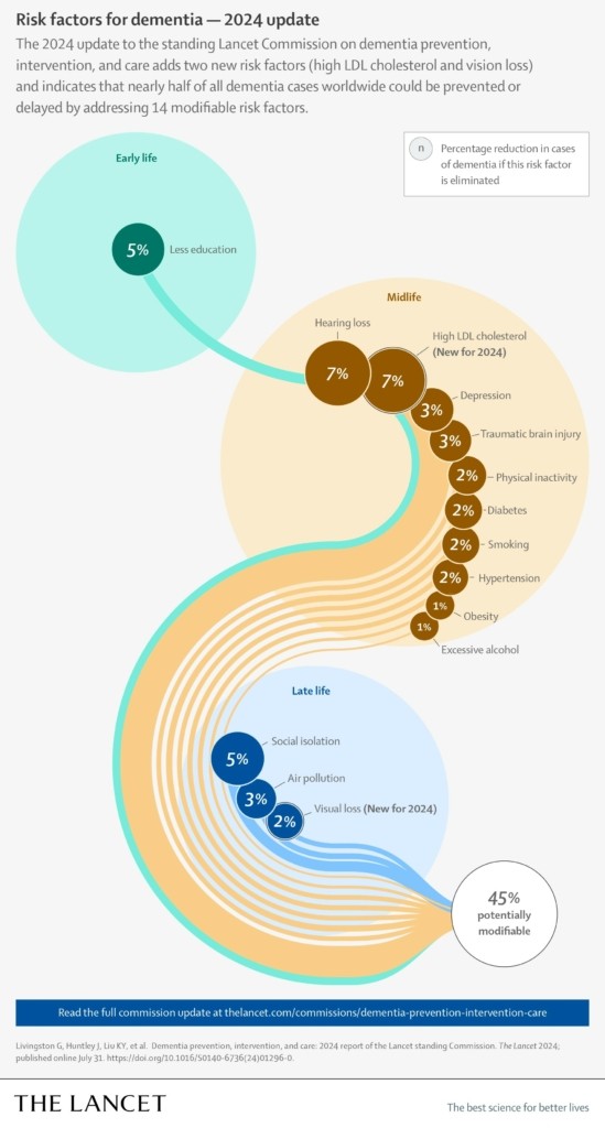 Η απώλεια ακοής και η απώλεια όρασης αυξάνουν τον κίνδυνο άνοιας, σύμφωνα με τα πιο πρόσφατα ευρήματα της επιτροπής του ιατρικού περιοδικού Lancet σχετικά με τον τρόπο πρόληψης της νόσου, η οποία δημοσιεύθηκε τον Ιούλιο του περασμένου έτους. Προσδιόρισε την κατάθλιψη, την υψηλή αρτηριακή πίεση, την ατμοσφαιρική ρύπανση και την κακή διατροφή ως άλλους παράγοντες κινδύνου.