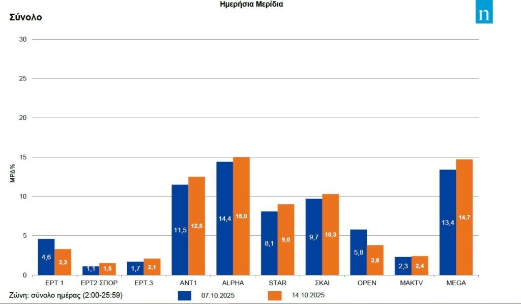 Χωρίς το δυνατό χαρτί του, τις ενημερωτικές εκπομπές, το Open υποχώρησε σε δυναμικότητα κάτω του 4%, παρέμεινε όμως πάνω από την ΕΡΤ1, η δυναμική της οποίας χωρίς τις ψυχαγωγικές εκπομπές ήταν οριακά πάνω από το πρώτο χαμηλό που κατέγραψε η Nielsen την περασμένη Κυριακή (12/10).