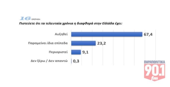 Οι 9 στους 10 θεωρεί πως η διαφθορά έχει αυξηθεί (67,4%) ή είναι στα ίδια επίπεδα (23,2%) τα τελευταία χρόνια επί κυβέρνησης ΝΔ.