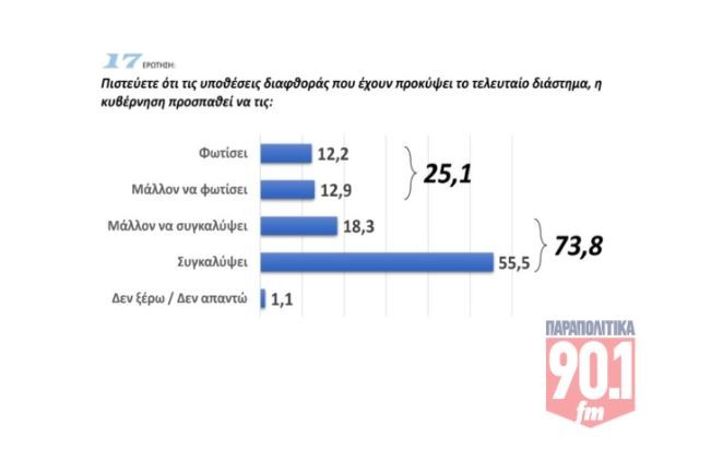 Ακόμη… χειρότερα για το κυβερνών κόμμα, είναι τα ποσοστά στο ερώτημα τι προσπαθεί να κάνει η κυβέρνηση με τις υποθέσεις διαφθοράς. Οι 3 στους 4 (73,8% για την ακρίβεια) λέει ότι προσπαθεί ή μάλλον προσπαθεί να την συγκαλύψει. Σίγουροι δε για συγκάλυψη, δηλώνουν σε ποσοστό 55,5%