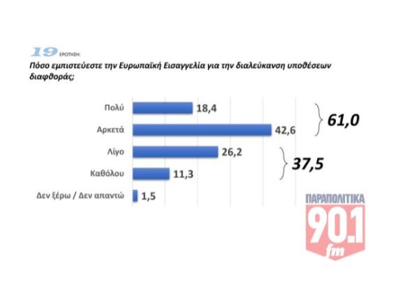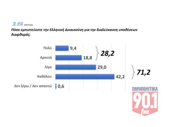Οσον αφορά το πόσο εμπιστεύονται την ελληνική δικαιοσύνη σε θέματα διαφθοράς, το 71,2% λέει «καθόλου» ή «λίγο». Σε μονοψήφιο ποσοστό είναι αυτοί που έχουν «πολύ» εμπιστοσύνη.