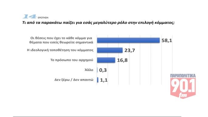 Οσον αφορά την επιλογή κόμματος και το βασικό κριτήριο του καθενός, το 58,1% δηλώνει ότι ψηφίζει με βάση τον σχεδιασμό των κομμάτων σε θέματα που τον ενδιαφέρουν, ενώ μόλις 23,7% ψηφίζει με βάση την ιδεολογία και 16,8% με κριτήριο τον πολιτικό αρχηγό.