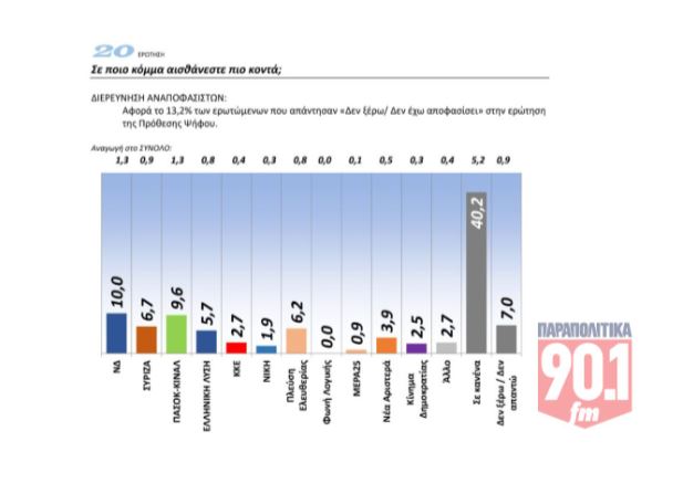 Βέβαια, το 40,2% λέει ότι κανένα κόμμα δεν αισθάνεται ότι το νιώθει πιο κοντά.