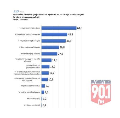 Οσον αφορά τα κριτήρια στην επιλογή του κόμματος στις επόμενες εκλογές, το 61,8% θα ψηφίσει το κόμμα που θα τον πείσει στο πρόγραμμά του για την αντιμετώπιση της ακρίβειας και το 45,5% με βάση την αναβάθμιση της δημόσιας υγειας. Τρίτη ακολουθεί η αντιμετώπισης της διαφθοράς και μετά η εξωτερική πολιτική / άμυνα και η αναβάθμιση της παιδείας.
