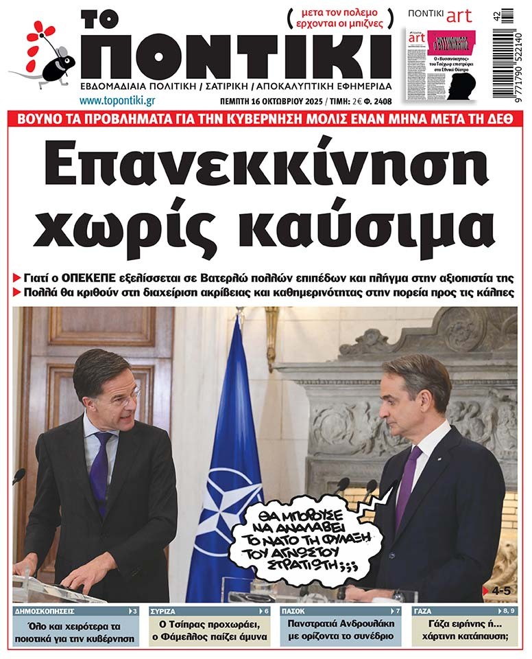 Με πρωτοσέλιδο τίτλο «Επανεκκίνηση χωρίς καύσιμα» και αναλυτικό – αποκαλυπτικό ρεπορτάζ για τον ΟΠΕΚΕΠΕ που εξελίσσεται σε Βατερλώ πολλών επιπέδων και πλήγμα στην αξιοπιστία της κυβέρνησης, αλλά και για το ότι πολλά θα κριθούν στη διαχείριση ακρίβειας και καθημερινότητας στην πορεία προς τις κάλπες, κυκλοφορεί το «ΠΟΝΤΙΚΙ» το πρωί της Πέμπτης.