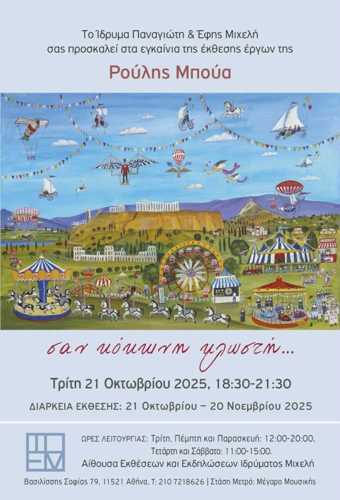 Εγκαίνια κάνει την Τρίτη 21 Οκτωβρίου η έκθεση έργων της ναΐφ ζωγράφου Ρούλης Μπούα με τίτλο «Σαν κόκκινη κλωστή…». Η έκθεση φιλοξενείται στην Αίθουσα Εκθέσεων και Εκδηλώσεων του Ιδρύματος Μιχελή (ισόγειο).