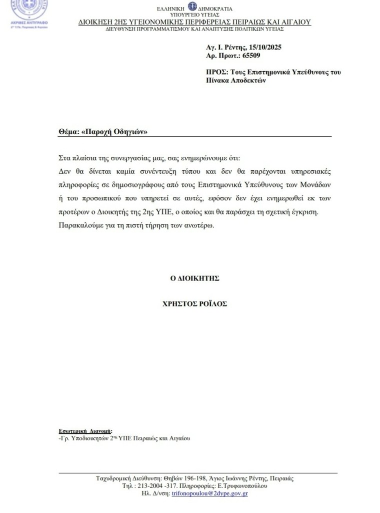 «Δεν θα δίνετε καμία συνέντευξη Τύπου και δεν θα παρέχονται υπηρεσιακές πληροφορίες σε δημοσιογράφους από τους επιστημονικά υπεύθυνους ή το προσωπικό των μονάδων, χωρίς προηγούμενη ενημέρωση και έγκριση του Διοικητή της 2ης ΥΠΕ. Παρακαλούμε για την πιστή τήρηση των ανωτέρω».