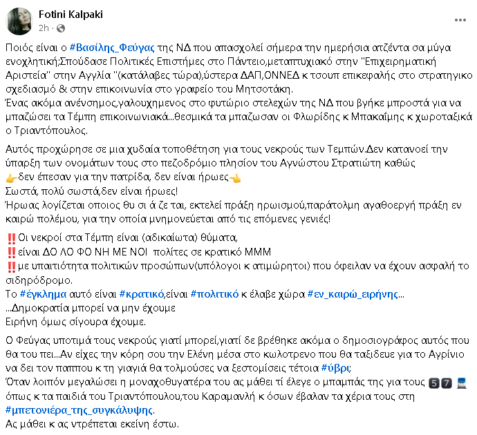 Μετά την νίκη της απεργίας πείνας του Πάνου Ρούτσι και το κυβερνητικό «μούδιασμα», το στέλεχος της ΝΔ δεν δίστασε να βεβηλώσει τη μνήμη των 57 θυμάτων των Τεμπών και να επιτεθεί ουσιαστικά στους συγγενείς τους.