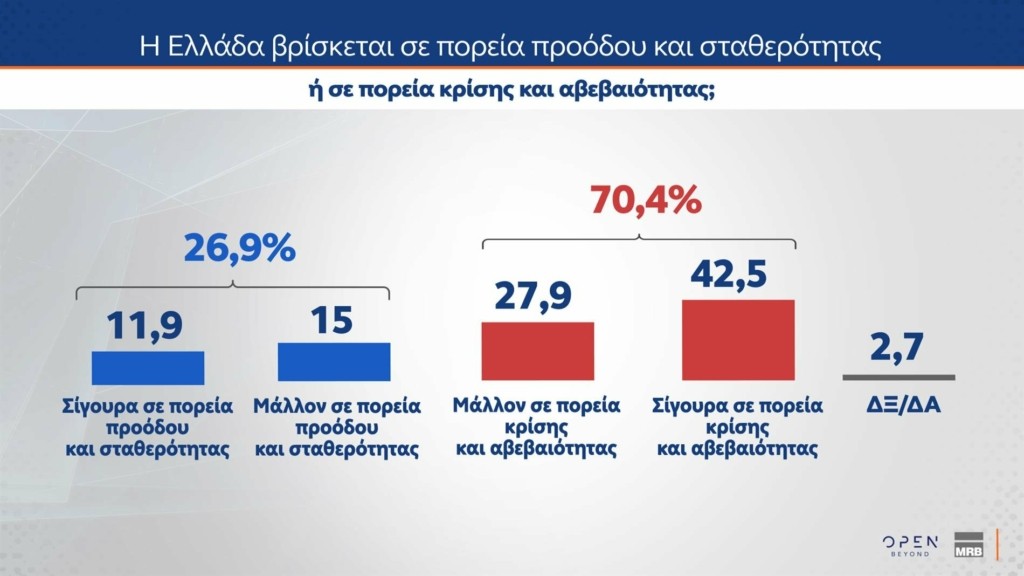 Αντίθετα, το 70,4% βλέπει πορεία κρίσης και αβεβαιότητας: το 27,9% «μάλλον» και το 42,5% «σίγουρα». Το 2,7% δεν απαντά.