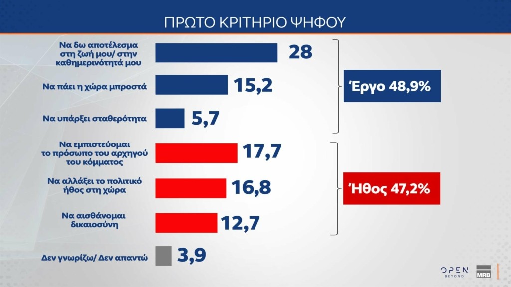 Συνολικά, το 48,9% ζητά έργο και αποτέλεσμα και το 47,2% αλλαγή πολιτικής ηθικής.