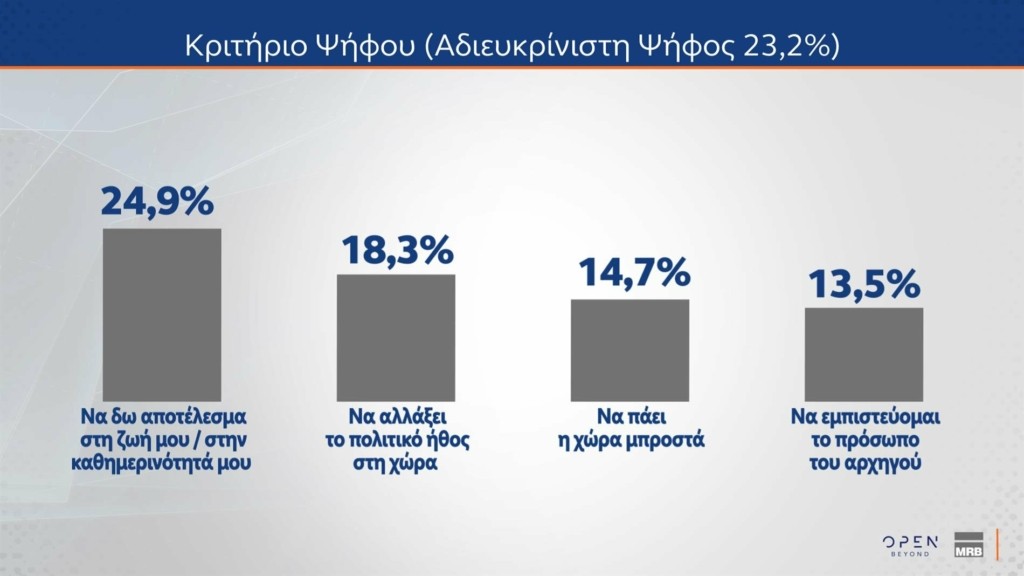 Μεταξύ των αναποφάσιστων, το 24,9% ζητά βελτίωση στη ζωή του, το 18,3% θέλει αλλαγή πολιτικού ήθους και το 14,7% επιθυμεί να «πάει η χώρα μπροστά».