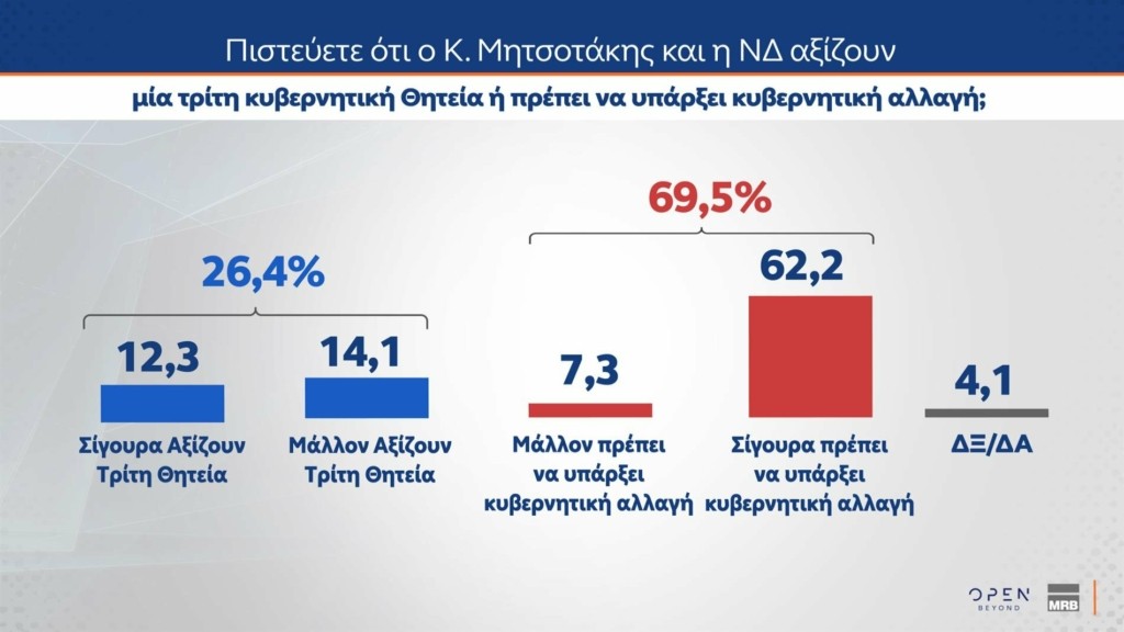 Στο ερώτημα αν ο Κυριάκος Μητσοτάκης και η Νέα Δημοκρατία αξίζουν μια τρίτη κυβερνητική θητεία ή αν πρέπει να υπάρξει κυβερνητική αλλαγή, μόλις το 26,4% απαντά θετικά.