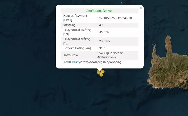 Σεισμός 4,1 Ρίχτερ σημειώθηκε στις 06:55 το πρωί της Παρασκευής (17/10) στη θαλάσσια περιοχή δυτικά της Κρήτης, πολύ κοντά στο νησί.