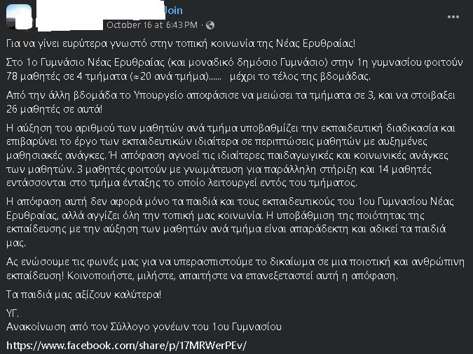 Αύριο, Δευτέρα, αναμένεται να γίνει και κινητοποίηση έξω από την διεύθυνση πρωτοβάθμιας εκπαίδευσης στην Αθήνα από συλλόγους Γονέων και Κηδεμόνων, καθώς και από δασκάλους.