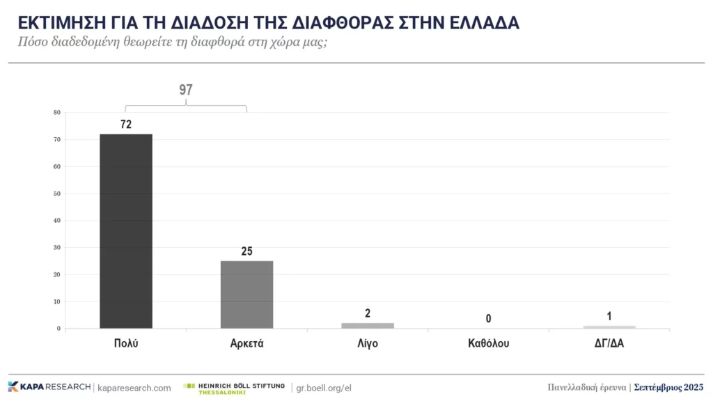 Κατ’ αρχάς, η έρευνα αποκαλύπτει ότι το 97% των συμμετεχόντων θεωρεί ότι η διαφθορά είναι αρκετά ως πολύ διαδεδομένη στη χώρα: πρόκειται για ένα συντριπτικό ποσοστό, το οποίο αν μη τι άλλο εξηγεί αλλά και λειτουργεί συμπληρωματικά στα υπόλοιπα, εξίσου δραματικά στοιχεία της έρευνας.