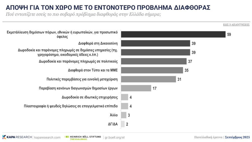 Όσον αφορά, δε, στους χώρους που… ενδημεί η διαφθορά, την πρώτη θέση καταλαμβάνει η διασπάθιση εθνικών ή ευρωπαϊκών πόρων (59%) και ακολουθούν η Δικαιοσύνη και τα διάφορα «γρηγορόσημα» (από 39%), η διαφθορά των πολιτικών (37%), η διαπλοκή στα ΜΜΕ (35%) και τα πολιτικά ρουσφέτια (31%).