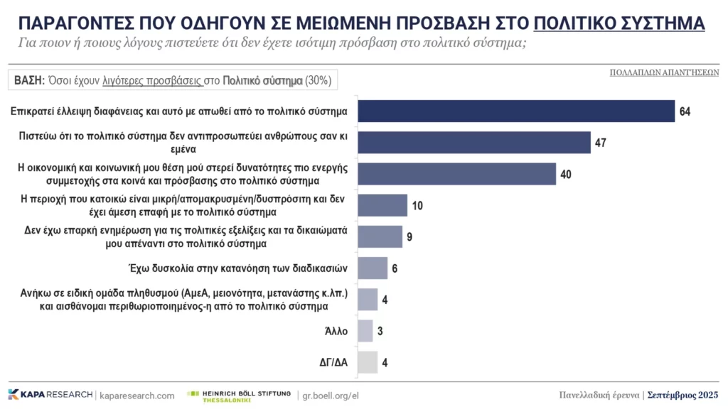 Όσον αφορά στη δυσκολία πολιτών να αποκτήσουν πρόσβαση στο πολιτικό σύστημα, το 65% διαγιγνώσκει έλλειψη διαφάνειας, το 47% αισθάνεται ξένο προς αυτό, το 40% αισθάνεται ότι η οικονομική του κατάσταση δεν του επιτρέπει να αποκτήσει πρόσβαση και το 10% αντιμετωπίζει αντικειμενικό πρόβλημα απόστασης.