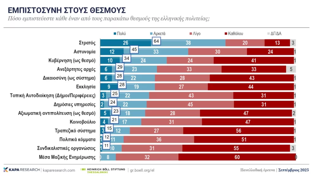 Γιατί, προφανώς σε μια χώρα με εκτεταμένη διαφθορά, είναι φυσικολογικό οι πολίτες να θεωρούν ότι υπάρχει θεσμική αποσάθρωση: το 92% δηλώνει ότι δεν εμπιστεύεται τα ΜΜΕ, το 81% τα συνδικάτα, το 86% τα πολιτικά κόμματα, το 71% τη Δικαιοσύνη, το 65% την κυβέρνηση, το 73% την Εκκλησία, το 66% τις Ανεξάρτητες Αρχές,… στην πραγματικότητα οι πολίτες μοιάζουν να γυρνούν την πλάτη σε όλους τους θεσμούς και μόνο ο στρατός διασώζεται, καθώς το 64% δηλώνει ότι τον εμπιστεύεται.