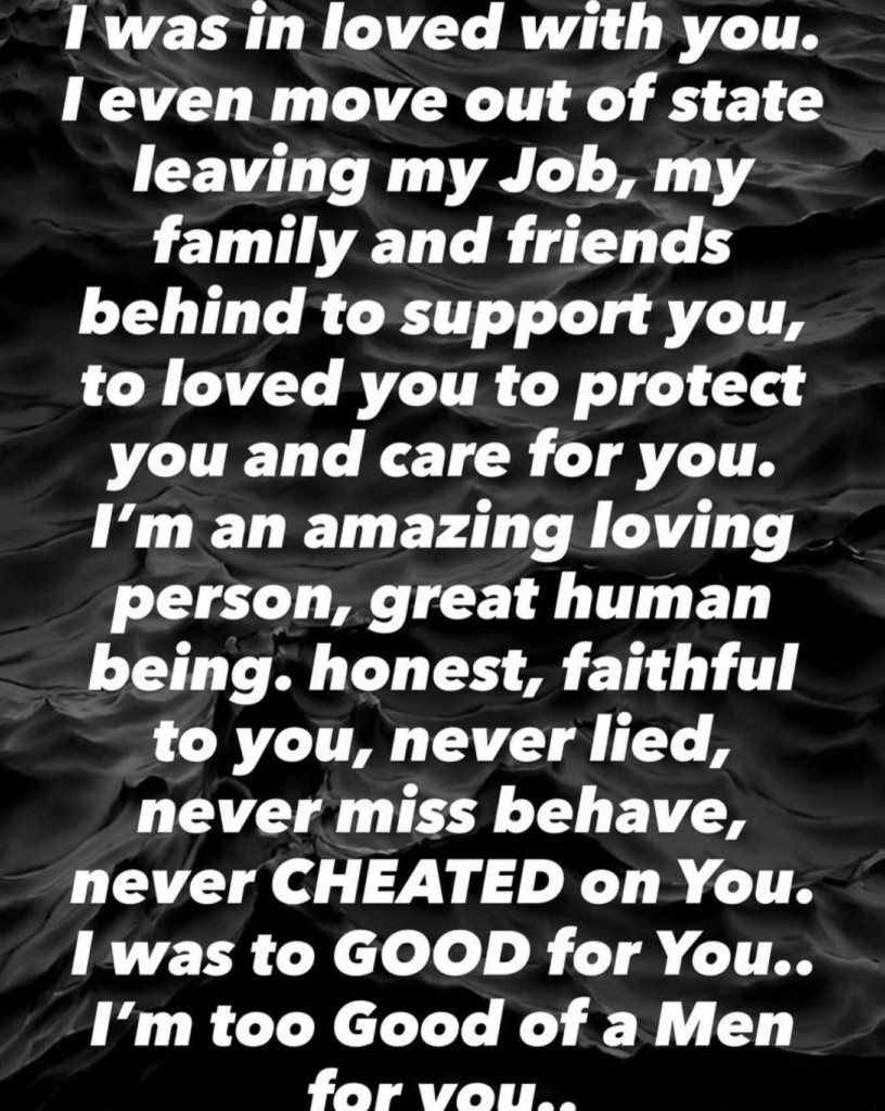 «Είμαι ένας υπέροχος, δοτικός άνθρωπος, ειλικρινής και πιστός. Ποτέ δεν σου είπα ψέματα, ποτέ δεν συμπεριφέρθηκα άσχημα, ποτέ δεν σε απάτησα. Ήμουν καλός μαζί σου. Ήμουν πολύ καλός για σένα» υπογράμμισε.