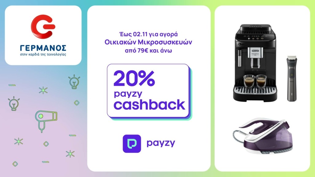 20% cashback κερδίζουν και οι καταναλωτές που θα αποκτήσουν με κάρτα payzy οικιακές μικροσυσκευές στον ΓΕΡΜΑΝΟ. Η προσφορά[3] ισχύει μέχρι και τις 2 Νοεμβρίου αποκλειστικά για αγορά οικιακών μικροσυσκευών συνολικής τελικής αξίας, ανά συναλλαγή, 79€ και άνω, στα καταστήματα ΓΕΡΜΑΝΟΣ ή στο germanos.gr.
