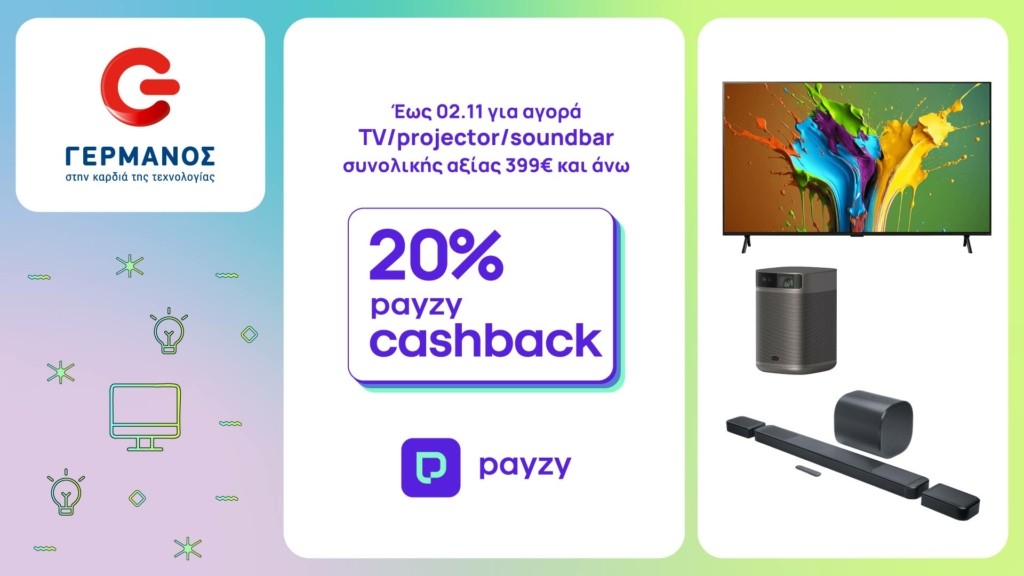 20% επιστροφή της αξίας των αγορών τους σε ευρώ (cashback) κερδίζουν οι καταναλωτές που θα αποκτήσουν με κάρτα payzy, έξυπνες τηλεοράσεις, projector και soundbar στα καταστήματα της COSMOTE TELEKOM και ΓΕΡΜΑΝΟΣ σε όλη την Ελλάδα αλλά και στα cosmote.gr και germanos.gr. Η προσφορά ισχύει μέχρι και τις 2 Νοεμβρίου για αγορές συνολικής τελικής αξίας, ανά συναλλαγή, 399€ και άνω[1].
