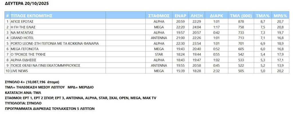 Τηλεθέαση: Υψηλή επίδοση ο Alpha στην «εκκίνηση» της εβδομάδας (20/10)