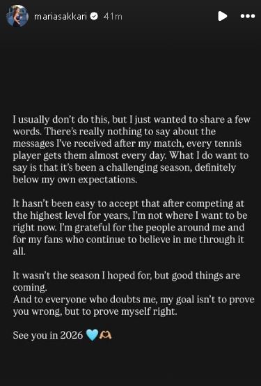 «Συνήθως δεν το κάνω αυτό, αλλά ήθελα να μοιραστώ μερικά λόγια. Δεν υπάρχουν πολλά να πεις για τα μηνύματα που δέχτηκα το ματς, κάθε τενίστας δέχεται καθημερινά ανάλογα μηνύματα. Ο λόγος που το κάνω είναι γιατί θέλω να πω πως ήταν μια δύσκολη σεζόν και σίγουρα κατώτερη των προσδοκιών μου. Δεν είναι εύκολο να αποδεχτώ ότι ενώ παίζω σε τοπ επίπεδο όλα αυτά τα χρόνια, δεν μπορώ να είμαι στο σημείο που θέλω. Χαίρομαι που έχω αθρώπους δίπλα μου και φιλάθλους που εξακολουθούν να πιστεύουν σε μέρα μέσα από όλα αυτά. Δεν ήταν η σεζόν που ήθελα, αλλά έρχονται ωραία πράγματα. Και σε όσους με αμφισβητούν. σκοπός μου δεν είναι να σας αποδείξω ότι είστε λάθος, σκοπός μου είναι να αποδείξω στον εαυτό μου τι μπορώ (να πετύχω). Τα λέμε το 2026»