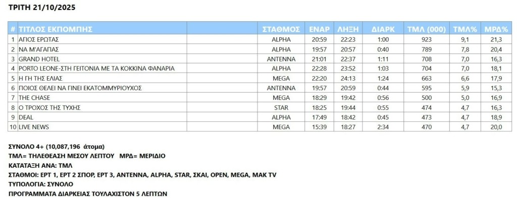Οδηγός στην κούρσα τηλεθέασης ήταν ο Alpha και την Τρίτη (21/10)