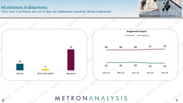 Αρνητικά αξιολογεί την κυβέρνηση το 72%, μία μονάδα ψηλότερα από τον Σεπτέμβριο και το 69% τον Κυριάκο Μητσοτάκη (από 71%).