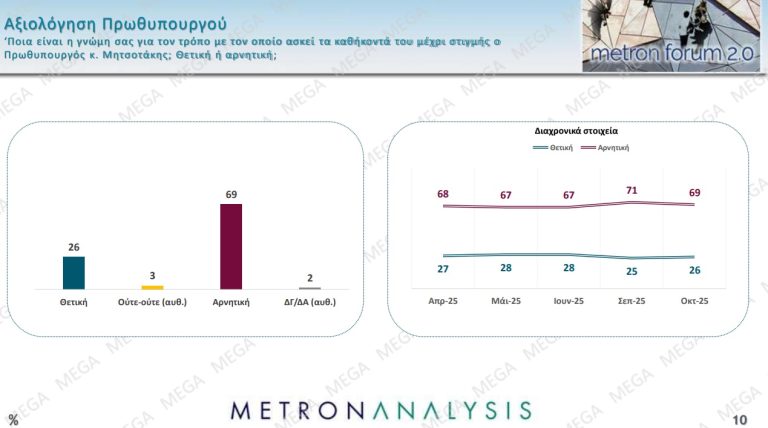 Τη δυσαρέσκεια της κοινής γνώμης για τους κυβερνητικούς χειρισμούς αποτυπώνουν τα ευρήματα της δημοσκόπησης της Metron Analysis για το MEGA. Οι πολίτες θεωρούν πως η χώρα βαδίζει στη λάθος κατεύθυνση, η αξιολόγηση της κυβέρνησης είναι αρνητική ενώ εξίσου αρνητική είναι και η αξιολόγηση για τον Κυριάκο Μητσοτάκη. Πλειοψηφικό είναι και το αίτημα για πολιτική αλλαγή, με το 49% μάλιστα να επιθυμεί πρόωρη προσφυγή στις κάλπες. Στην πρόθεση ψήφου απώλειες καταγράφουν τόσο η Νέα Δημοκρατία, όσο και το ΠΑΣΟΚ.