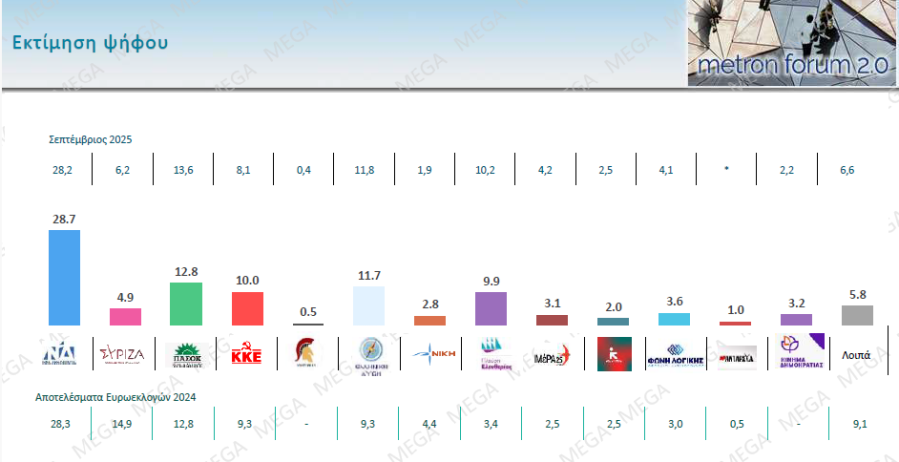 Στην εκτίμηση ψήφου προκύπτει Βουλή με εννιά κόμματα, ενώ το προβάδισμα της ΝΔ διαμορφώνεται στις 15,9 ποσοστιαίες μονάδες, καθώς συγκεντρώνει το 28,7% έναντι 12,8% του ΠΑΣΟΚ. Η Ελληνική Λύση με 11,7% είναι τρίτο κόμμα, μπροστά από το ΚΚΕ (10%), την Πλεύση Ελευθερίας (9,9%), τον ΣΥΡΙΖΑ (4,9%), τη Φωνή Λογικής (3,6%), το ΜέΡΑ25 (3,1%) και το Κίνημα Δημοκρατίας (3,2%).
