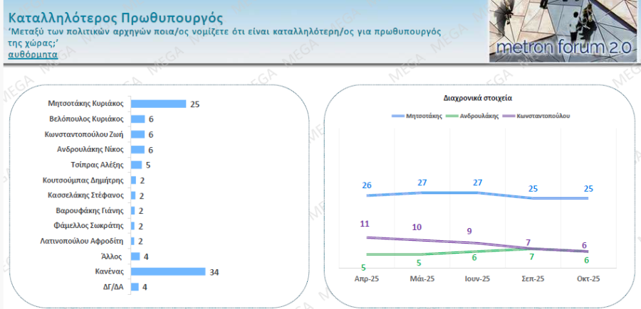 Στο ερώτημα για τον καταλληλότερο πρωθυπουργό, η απάντηση «κανένας» κυριαρχεί με 34%. Ο Κυριάκος Μητσοτάκης συγκεντρώνει το 25% και από 6% οι Κυριάκος Βελόπουλος, Ζωή Κωνσταντοπούλου και Νίκος Ανδρουλάκης, ενώ στο 5% είναι ο Αλέξης Τσίπρας. Σημειώνεται ότι οι ερωτηθέντες έδωσαν αυθόρμητα απαντήσεις και όχι με έτοιμη λίστα.